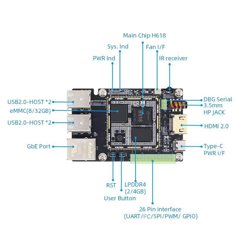 ● Perifeerne liides on rikkalik ja põhilaud viib välja USB OTG/HOST, I2CSPI, PWM, I2S, HDMI, UART ja muud liidesed Stamp Hole'i ühenduse kaudu.