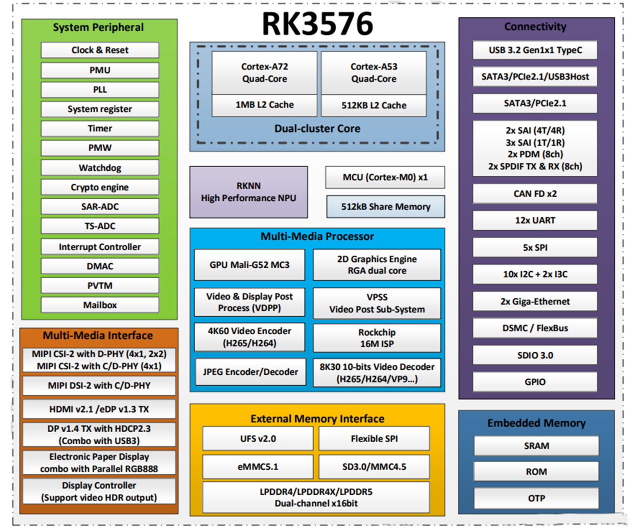 Rockchip RK3576 Teise põlvkonna 8Nm kõrgjõudlusega Aioti platvorm on suure jõudlusega, vähese energiatarbega SoC (System-On-Chip) protsessor, mis sobib mitmesuguste rakendusstsenaariumide jaoks, näiteks ARM-põhised personaalarvutid, servade arvutusseadmed ja isiklikud mobiilsed Interneti-seadmed. See kasutab kaheksatuumalist CPU-d, mis põhineb ARM-i arhitektuuril, integreerib sõltumatu 6TOPS (TERA toimingud sekundis) NPU (närvivõrgu nelik töötlemisüksus), integreerib mitu arvutussüdamikut, näiteks GPU, MCU, VPU, ja sellel on rikkalik perifeerne liides, et täita keeruka stseeni nõudeid. Lisaks toetab RK3576 ka UFS -i (Universal Flash Storage) salvestusruumi, pakkudes tõhusaid andmete salvestamise ja lugemisvõimalusi.